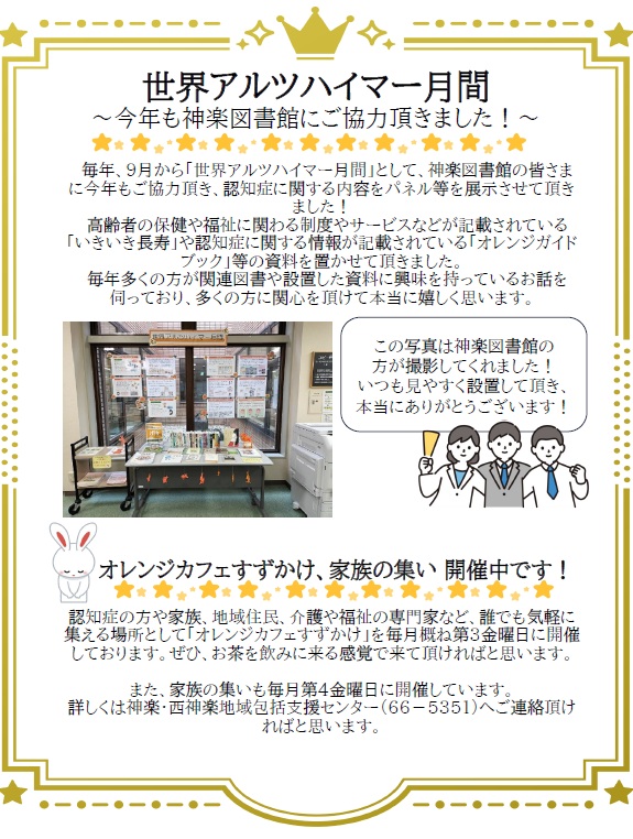 ① 認知症に関する相談 ② 認知症の方を支える地域づくりや、本人、家族に関する 支援を行います。 |